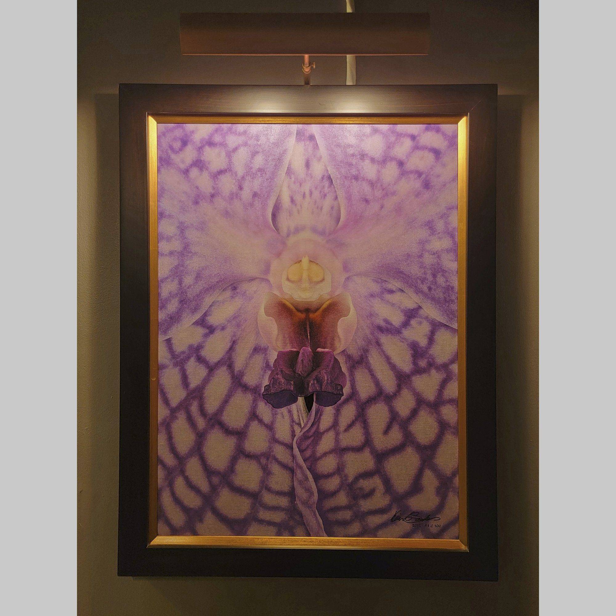 This intimate perspective highlights the intricate net-like patterns and the incredibly deep, saturated color of this beloved Vanda hybrid. Created in 2013, this piece is a testament to timeless, human artistry long before the age of AI. It is a tangible piece of art history, an heirloom to anchor a legacy of discerning taste. Each piece is presented in a museum-grade frame to protect and enhance your investment.